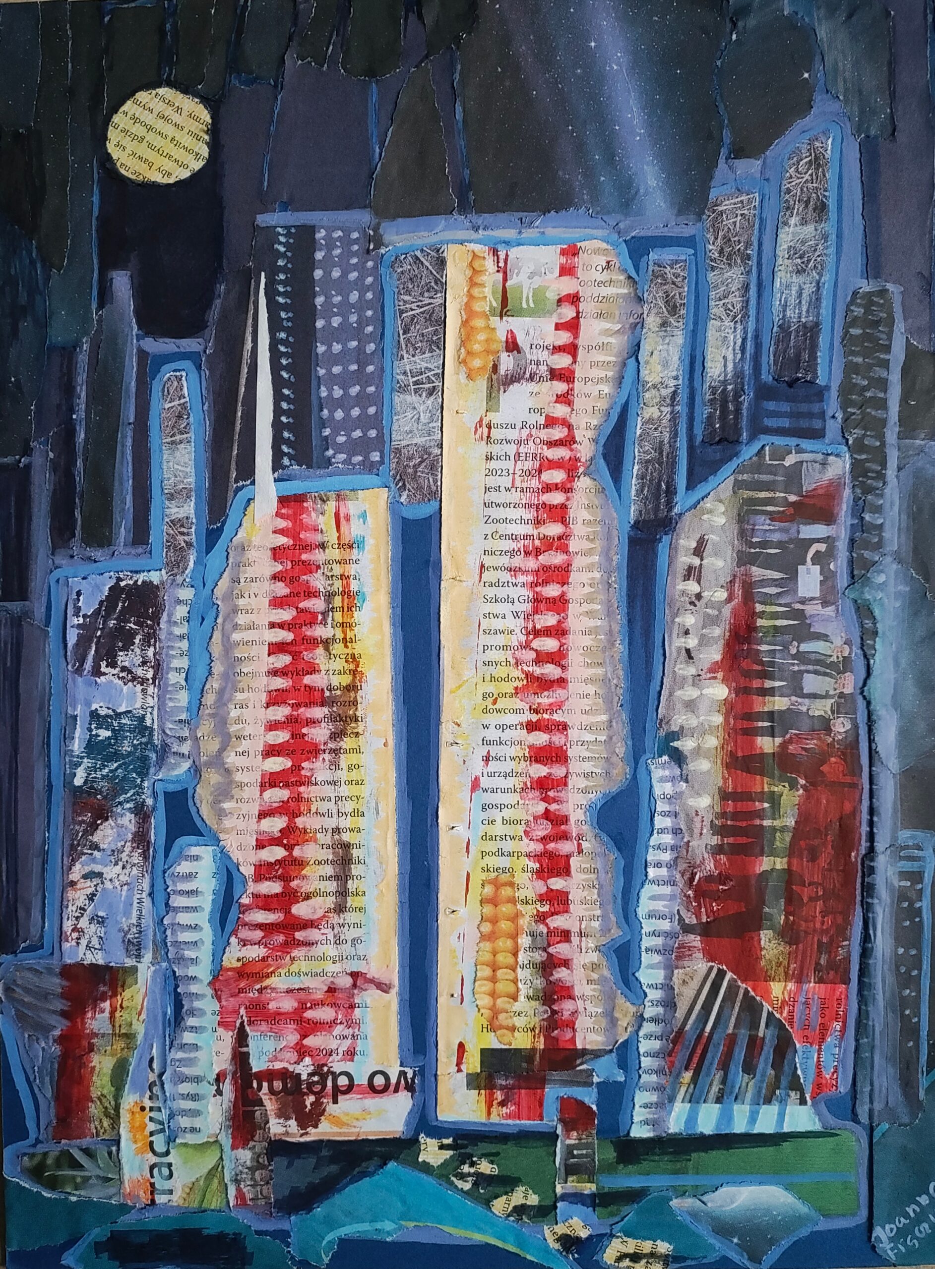 „Big city lights” to ekspresyjna, wielowarstwowa kompozycja abstrakcyjna, w której artystka wykorzystuje kolaż, farbę, strukturę i świadome rozdarcia papieru, aby stworzyć sugestywną wizję metropolii nocą. Pionowe formy przypominające wieżowce, intensywne światła oraz kontrast między zimnymi błękitami a dynamiczną czerwienią budują atmosferę nowoczesnego miasta – pełnego energii, ruchu i kontrastów.
