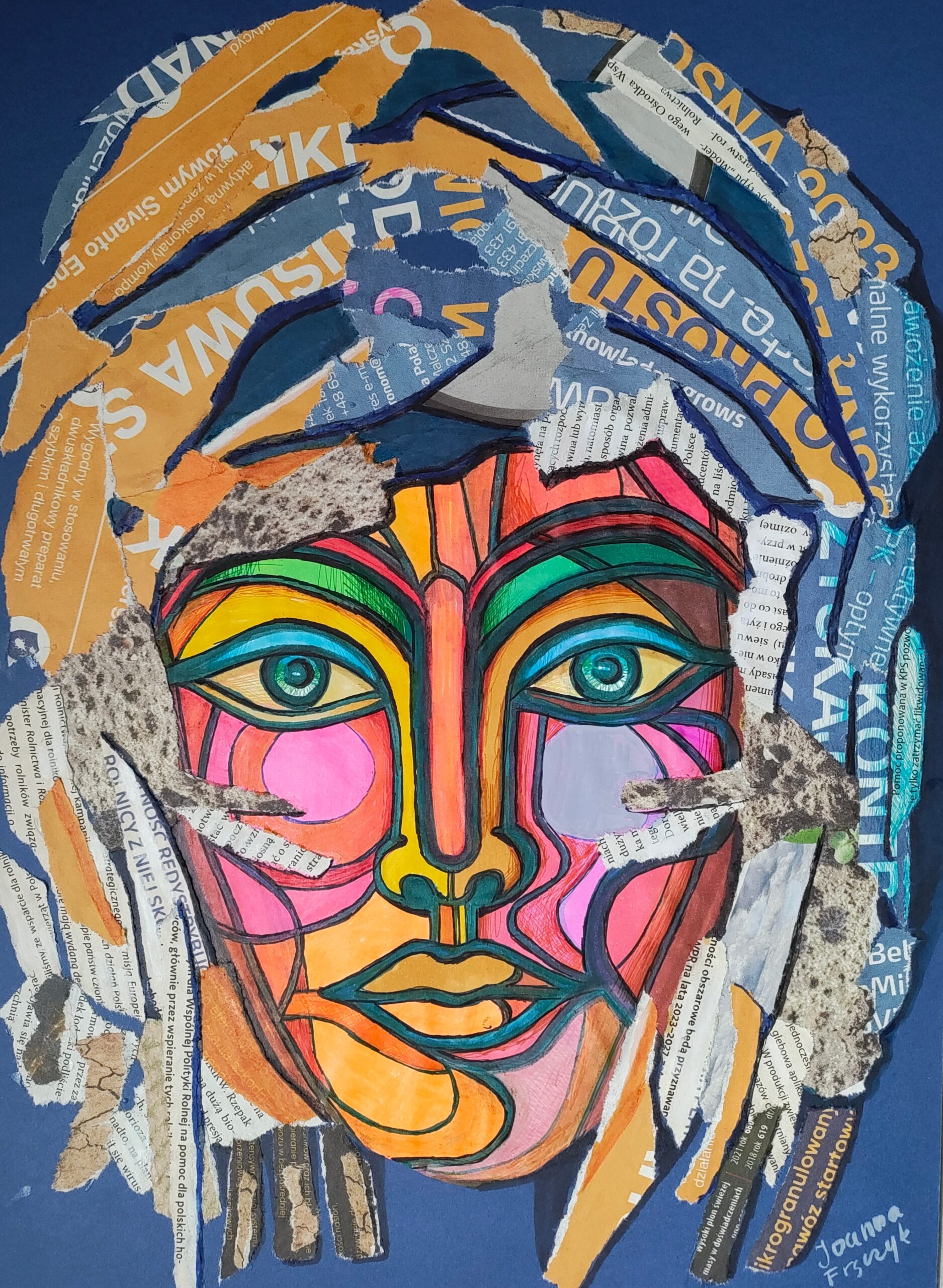 • Twarz jest wykonana w stylu inspirowanym kubizmem lub sztuką afrykańską – wyraziste linie, mocne kontury, intensywne barwy.